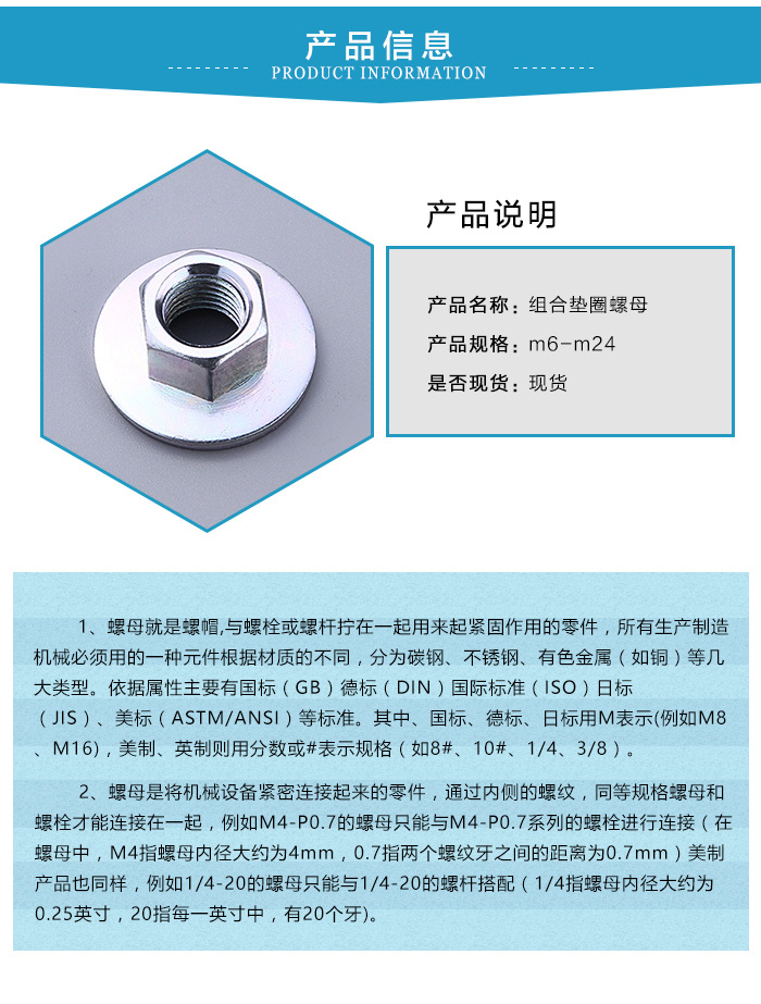 一般常見的六角彈墊組合螺母規格大致都在M20以下,因為大部分六角彈墊組合螺母都是用在管道及法蘭盤上,所以受工件約束,六角彈墊組合螺母規格同螺母相比比較少一些。M20以上的一些六角彈墊組合螺母大多為平面法蘭,就是法蘭面上沒有齒紋,這些螺母大部分用在一些特殊設備和特殊地方,一般銷售廠家沒有現貨。