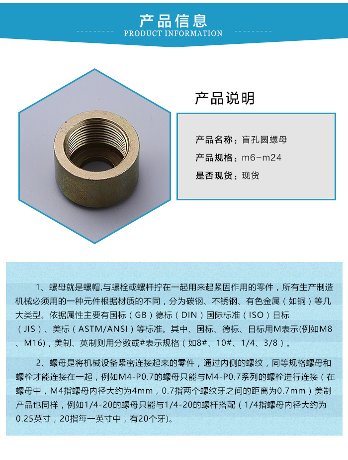 盲孔圓螺母就是螺帽,與螺栓或螺桿擰在一起用來起緊固作用的零件,所有生產(chǎn)制造機械必須用的一種原件.盲孔圓螺母的種類繁多,我們常見的有國標,英標,美標,日標的盲孔圓螺母.盲孔圓螺母根據(jù)材質(zhì)的不同,分為碳鋼、高強度、不銹鋼、塑鋼等幾大類型.根據(jù)產(chǎn)品屬性對應國家不同的標準號分為普通、非標、(老)國標、新國標、美制、英制、德標。大小不同,螺紋不等分為不同的規(guī)格. 一般國標、德標用M表示(例如M8、M16),美制、英制則用分數(shù)或#表示規(guī)格(如8#、10#、1/4、3/8)。