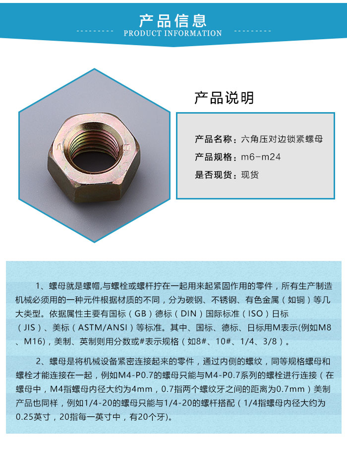 市場上銷售的質量比較好的六角壓對邊鎖緊螺母在螺母的內圓面鑲有與該六角壓對邊鎖緊螺母螺紋一致的銅制小塊,用于避免徑向頂緊螺釘直接與被鎖螺紋接觸而損壞后者。這種六角壓對邊鎖緊螺母在旋轉運動類零件的軸端鎖緊場合逐步開始應用,比如滾珠絲杠安裝端軸承的防松。