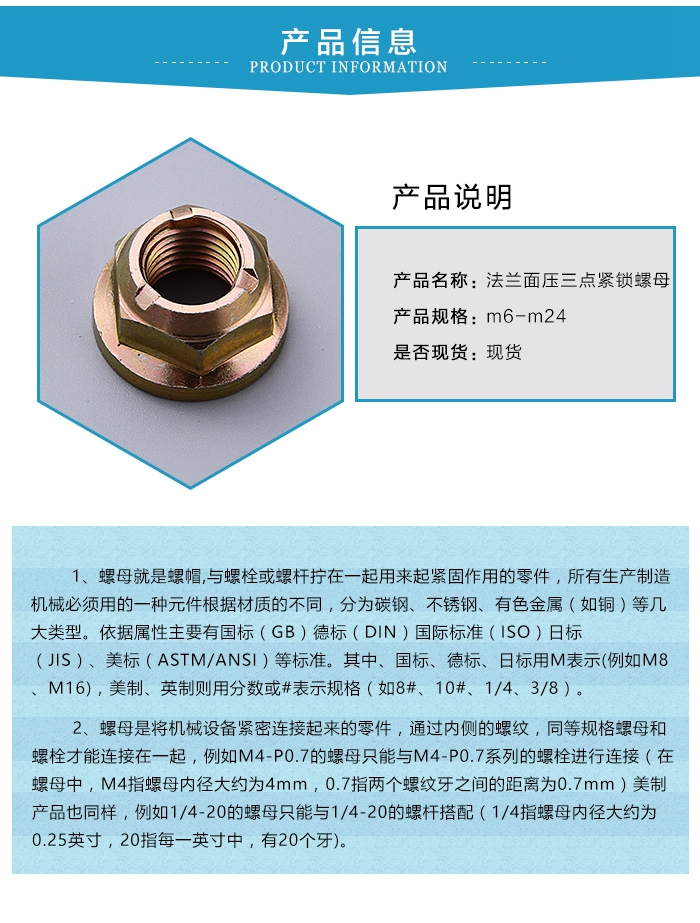 法蘭面壓三點(diǎn)緊鎖螺母和一般的六角螺母尺寸與螺紋規(guī)格基本相同,只不過比六角螺母相比,它是墊片和螺母是一體式的,而且在下面有防滑的齒紋,這樣增大了螺母與工件的表面積接觸,相比普通螺母加墊圈的組合,更加牢固和拉力更大。