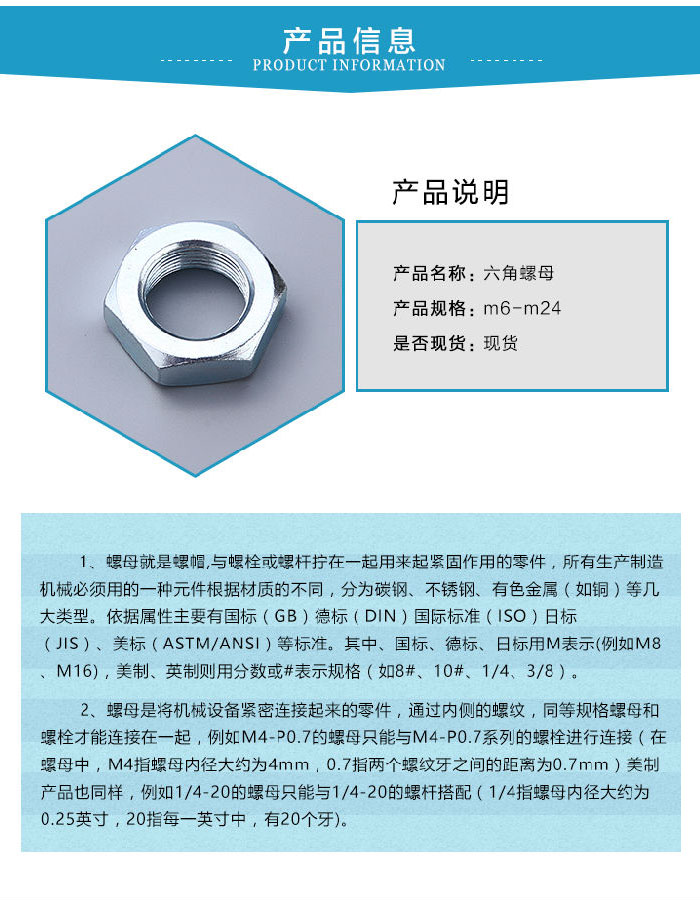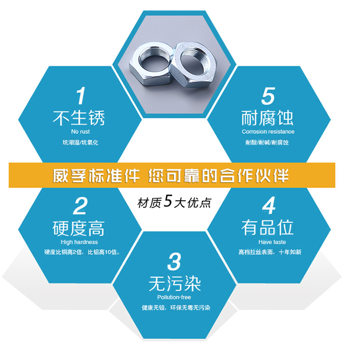 WF003六角螺母與螺栓、螺釘配合使用,起連接緊固機件作用。WF003六角螺母的中經1型六角螺母應用z廣,C級螺母用于表面比較粗糙、對精度要求不高的機器、設備或結構上;A級和B級螺母用于表面比較光潔、對精度要求較高的機器、設備或結構上。